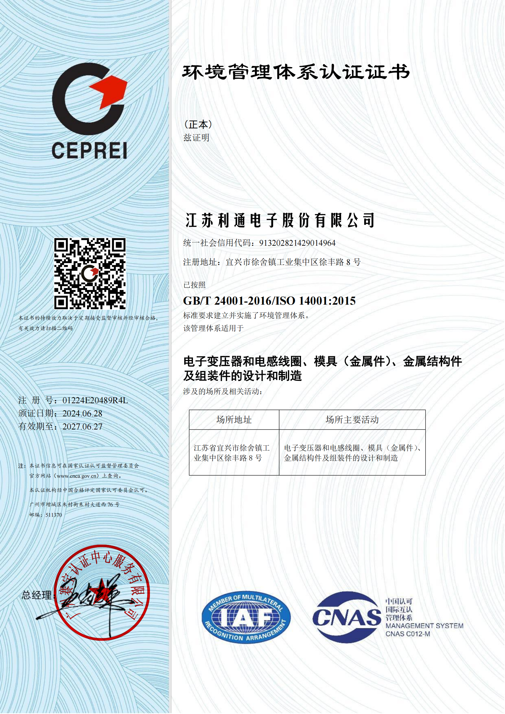 ISO 14001 環(huán)境管理體系認(rèn)證證書