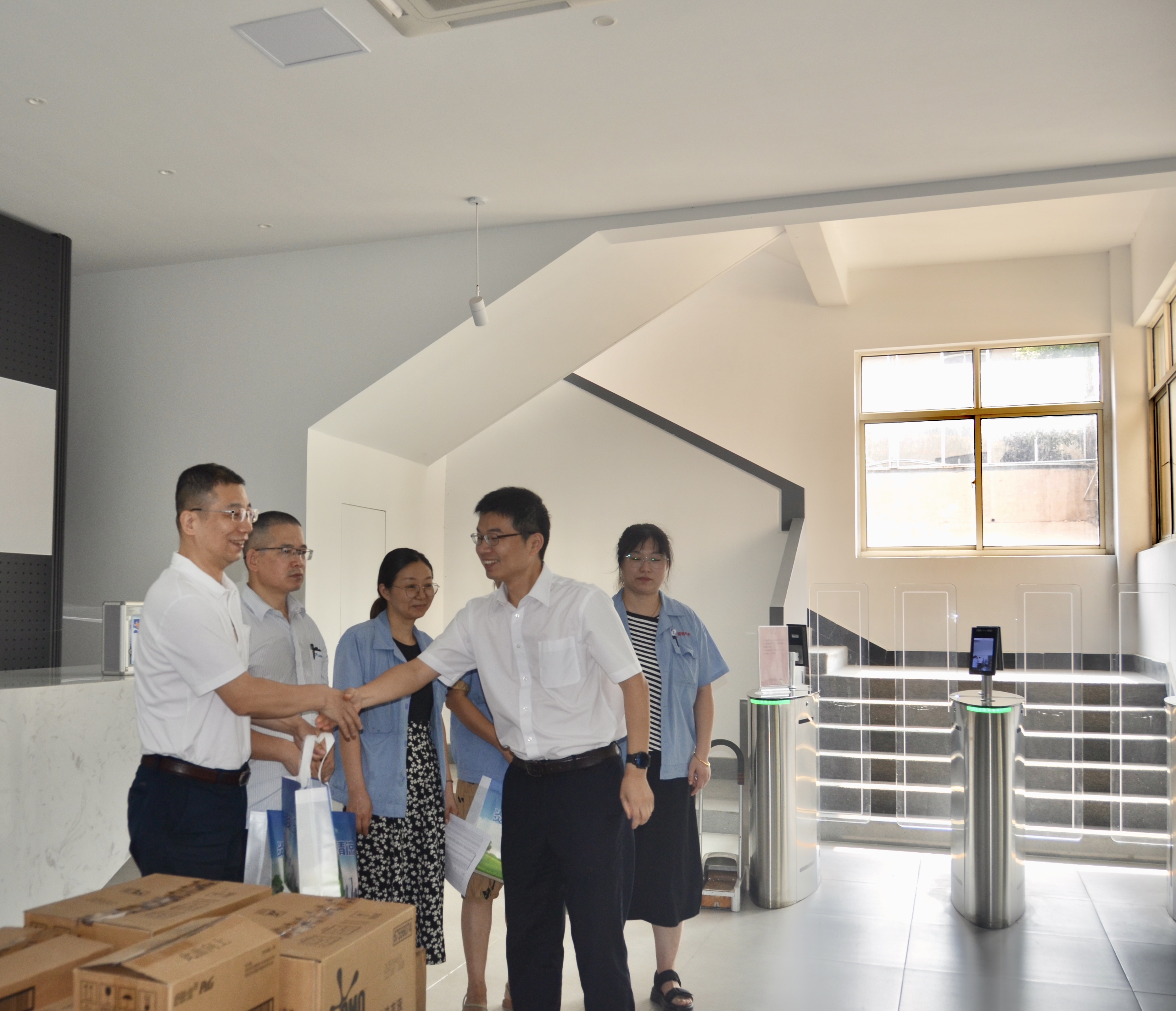 “炎炎夏日送清涼,濃濃關(guān)愛沁人心。”近日,徐舍鎮(zhèn)黃鎮(zhèn)長(zhǎng)攜鎮(zhèn)總工會(huì)及相關(guān)領(lǐng)導(dǎo)一行來我司開展送清涼活動(dòng),走訪慰問奮斗在高溫崗位的一線員工,為他們送去了防暑降溫用品,讓他們?cè)诳崾钪懈惺艿揭唤z清涼。活動(dòng)中,徐舍鎮(zhèn)相關(guān)領(lǐng)導(dǎo)及工會(huì)向奮戰(zhàn)在一線的勞動(dòng)者表示由衷的感謝和問候,與員工代表們親切交談,叮囑大家注意勞逸結(jié)合,防暑降溫,確保安全生產(chǎn)工作有序進(jìn)行。開展“夏送清涼"的活動(dòng),是工會(huì)關(guān)心職工生活,保障職工權(quán)益的重要舉措,我司把防暑降溫工作作為夏季重點(diǎn)工作來抓。切實(shí)關(guān)心職工身體健康和勞動(dòng)安全。把防暑降溫工作和勞動(dòng)安全保障落實(shí)到各高溫崗位的職工,讓他們?cè)谘籽紫娜崭惺艿轿镔|(zhì)、精神的雙清涼。